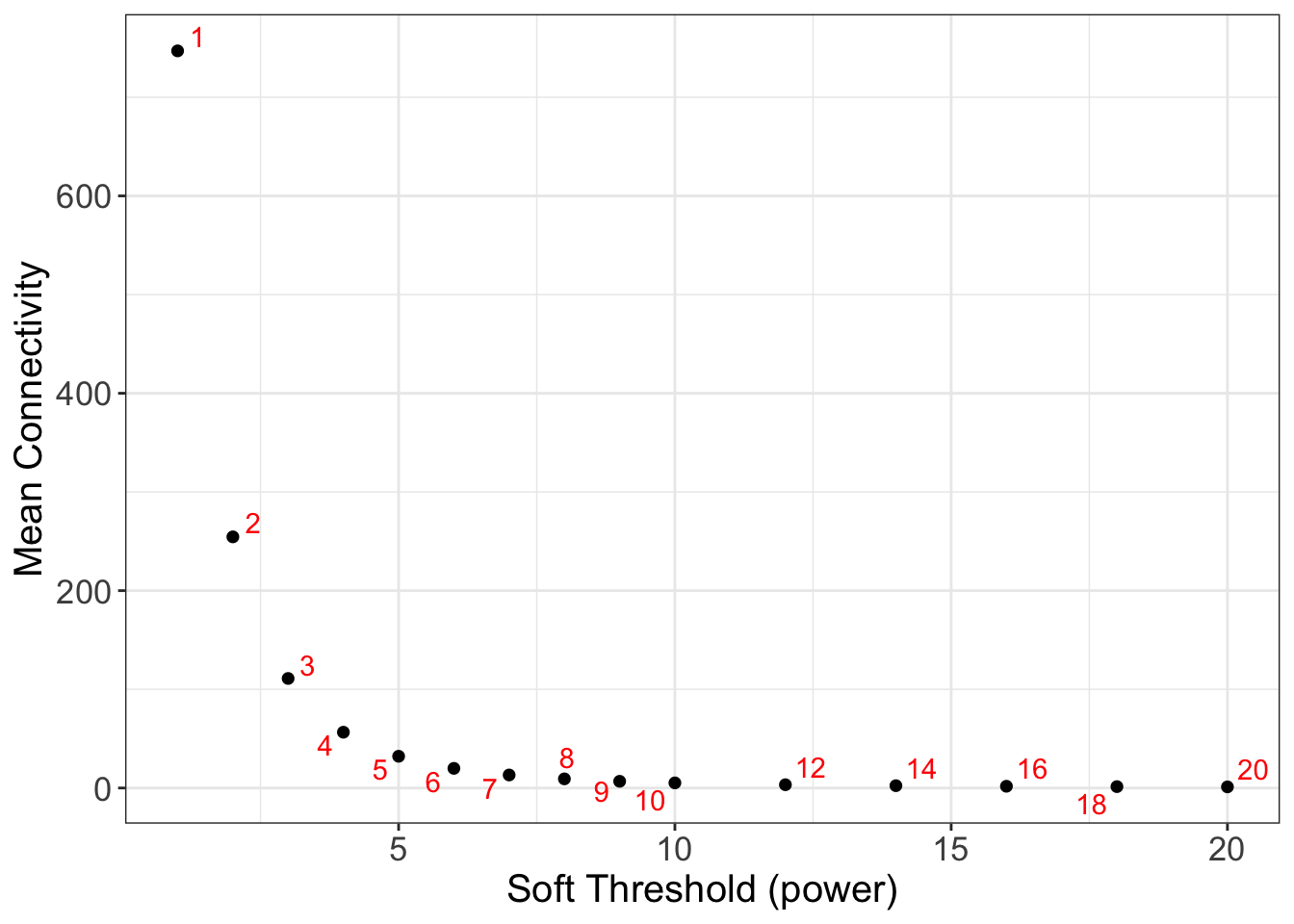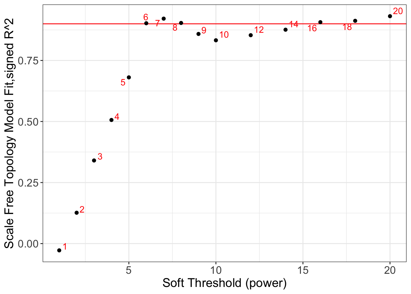 在这里使用的是power函数.需要设置soft threshold,这时候需要确定power函数的参数β.如何选择合适的β呢?WGCNA的作者提供了两个标准: