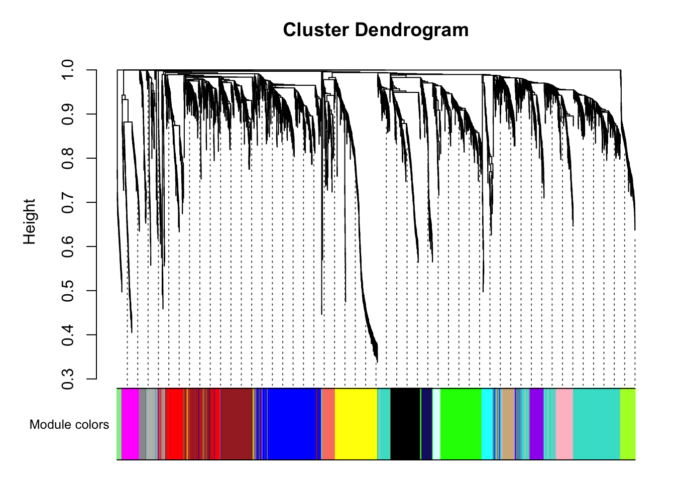 得到TOM值之后,也就得到了TOM矩阵.然后利用TOM矩阵,就可以对基因进行聚类了.WGCNA中使用的是层级聚类,聚类结束之后,就可以对分支进行剪切区分.得到module.