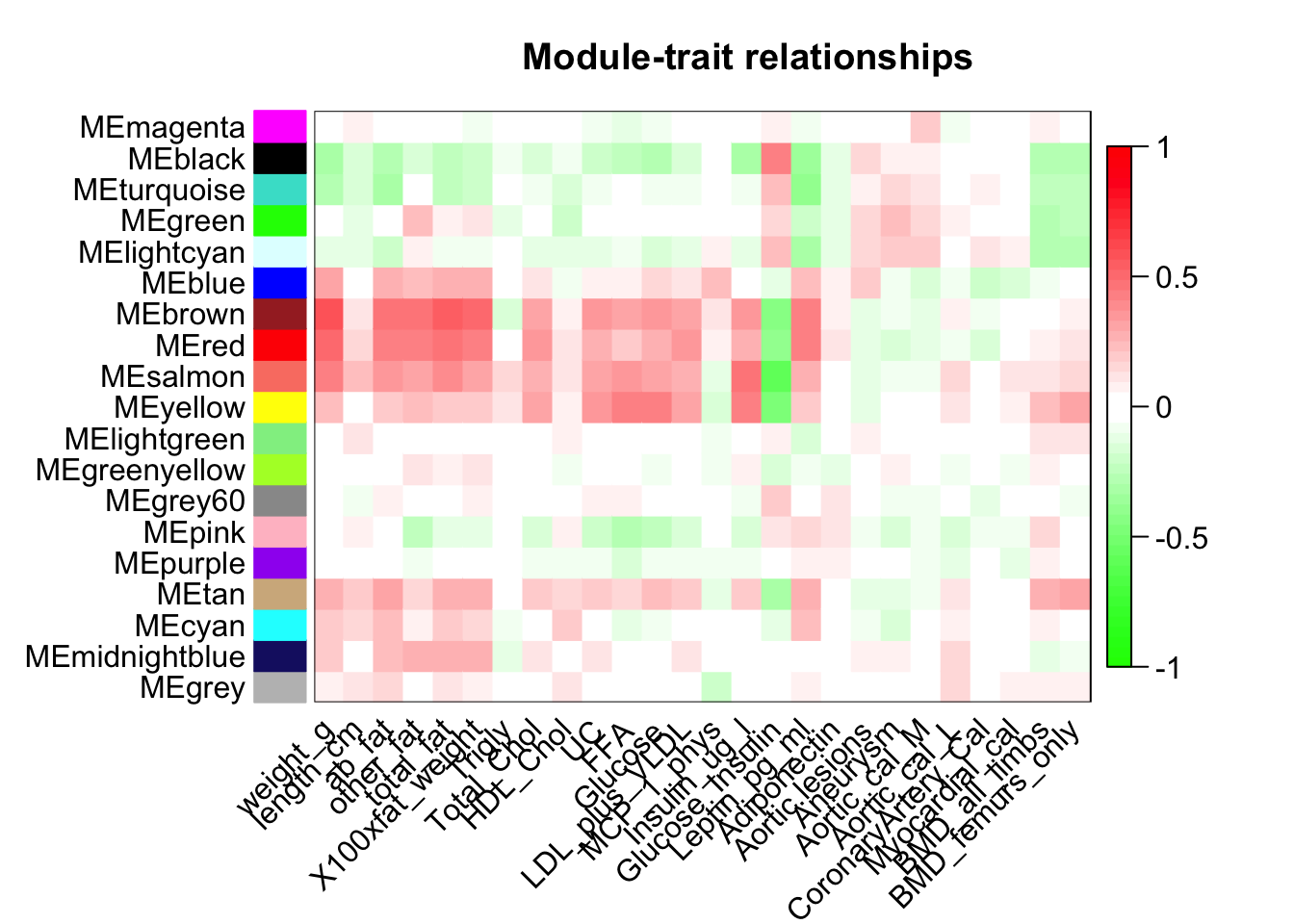 然后我们使用WGCNA中的cor函数计算module和clinical data的相关性.