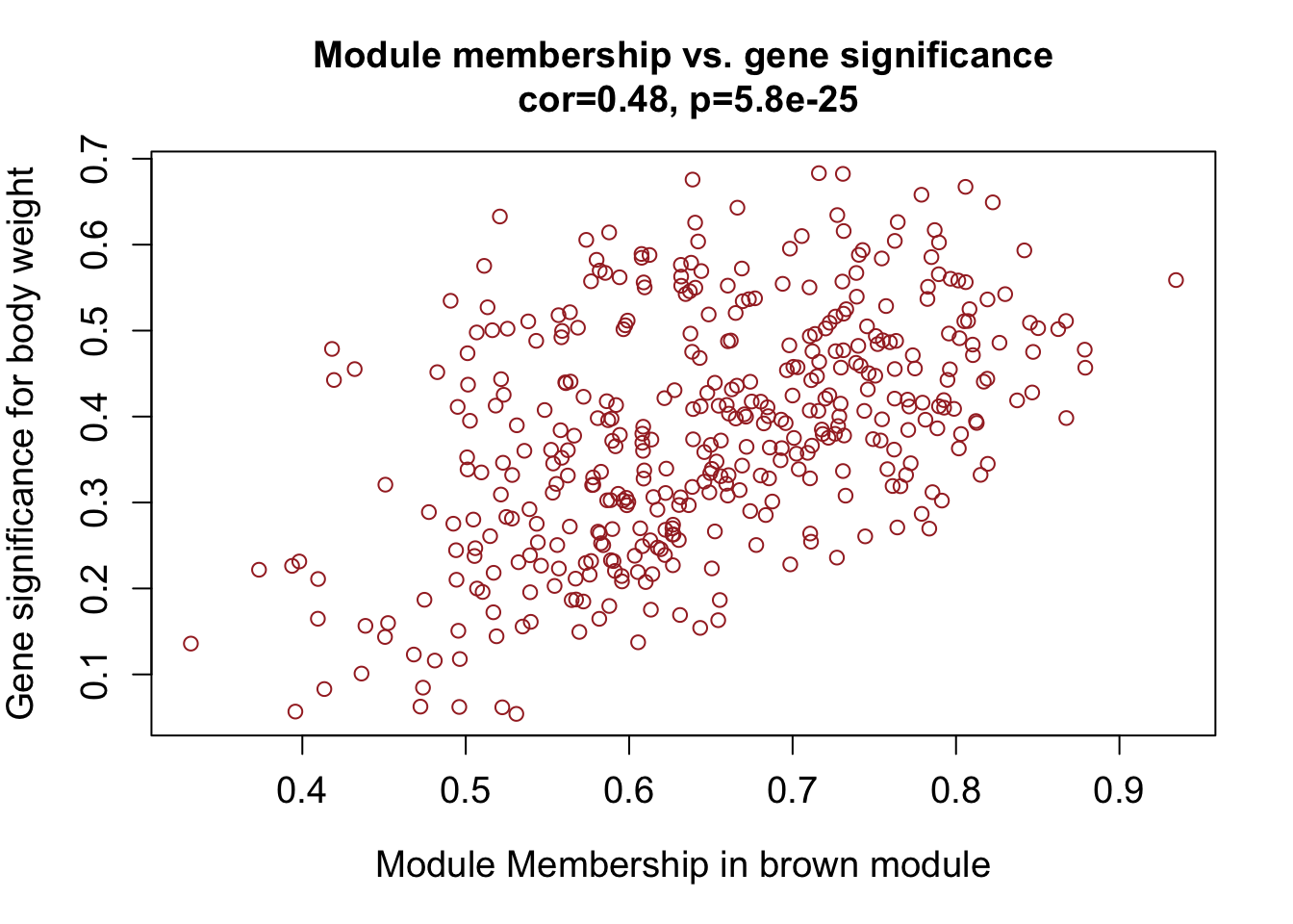names(GSPvalue) = paste("p.GS.", names(weight), sep = "")Intramodular analysis: identifying genes with high GS and MM